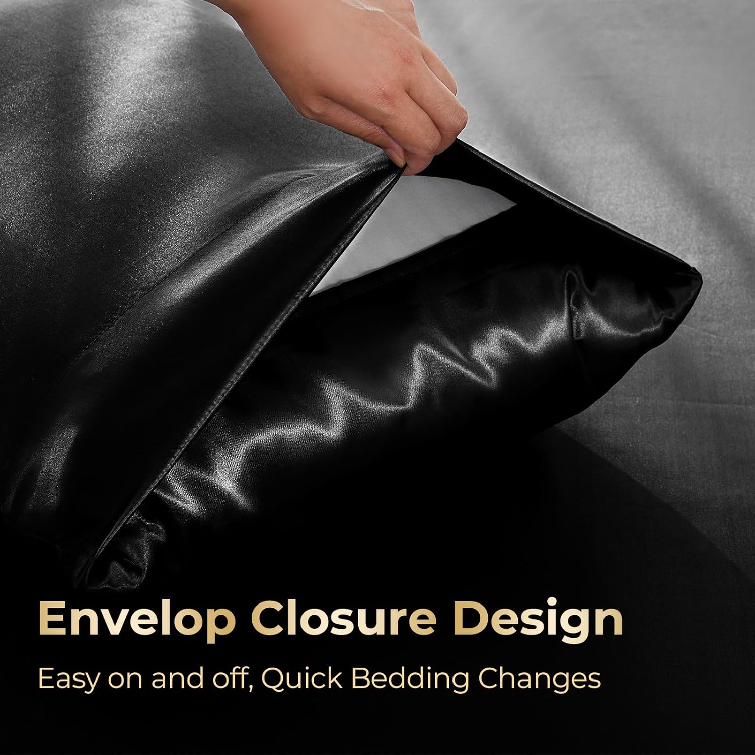 Sasttie Satin Sheets Queen Size - 4 Pieces Luxury Soft Black Silky Bed Sheets Set with Pillowcases - Smooth Silk-Like Satin Fabric, Reinforced 14 Inches Pocket, Oeko-Tex Certified